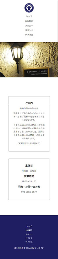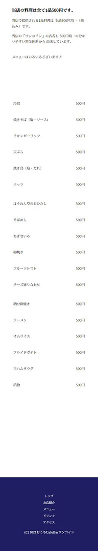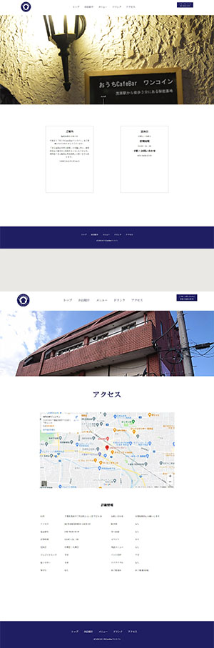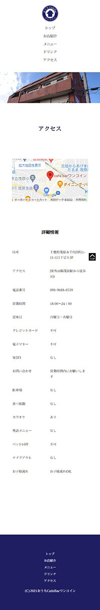 | サイト紹介文 | 千葉県茂原市にある「おうちCafeBarワンコイン」様のサイト。トップページを含む5ページ構成のWebになっています。(レスポンシヴ対応:PC/モバイル) |