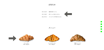 jQueryプラグインslickを使ったスライダーでクロワッサンの質感をアピールしました。なお店内写真の一部はPhotoshopで画像を編集してあります。