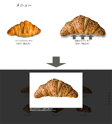メニュー画像をホバーすると画像が拡大・浮き上がるマウスオーバーエフェクトとjQueryプラグインのlightboxを使い、メニューをクリックすると拡大画像と目ニューの詳細が表示される仕組みを実装しました。