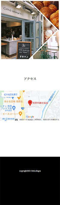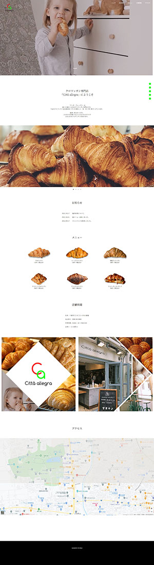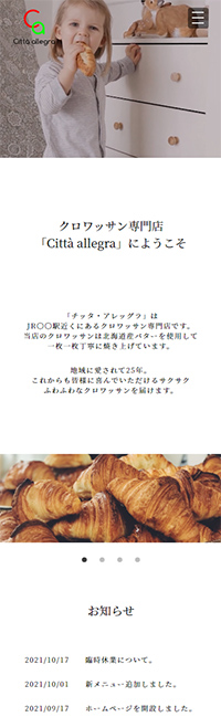 | サイト紹介文 | 架空のクロワッサン専門店「Citta Allegra(チッタ・アレッグラ)」のサイト。4つのページ内リンクのある1ページもののWebになっています。 |